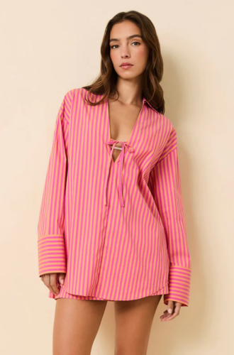 This Livia tunic orange soda is my favorite. I mean, just look at this, it not only gives you a beachy vibe but will even make you shine at the sunset. It’s vibrant, bold, and ready to soak up every sunbeam. It`s cheerful orange and pink striped pop makes it feel like a sunset cocktail crossed with a seashell parade, a total beach vibe magnet!